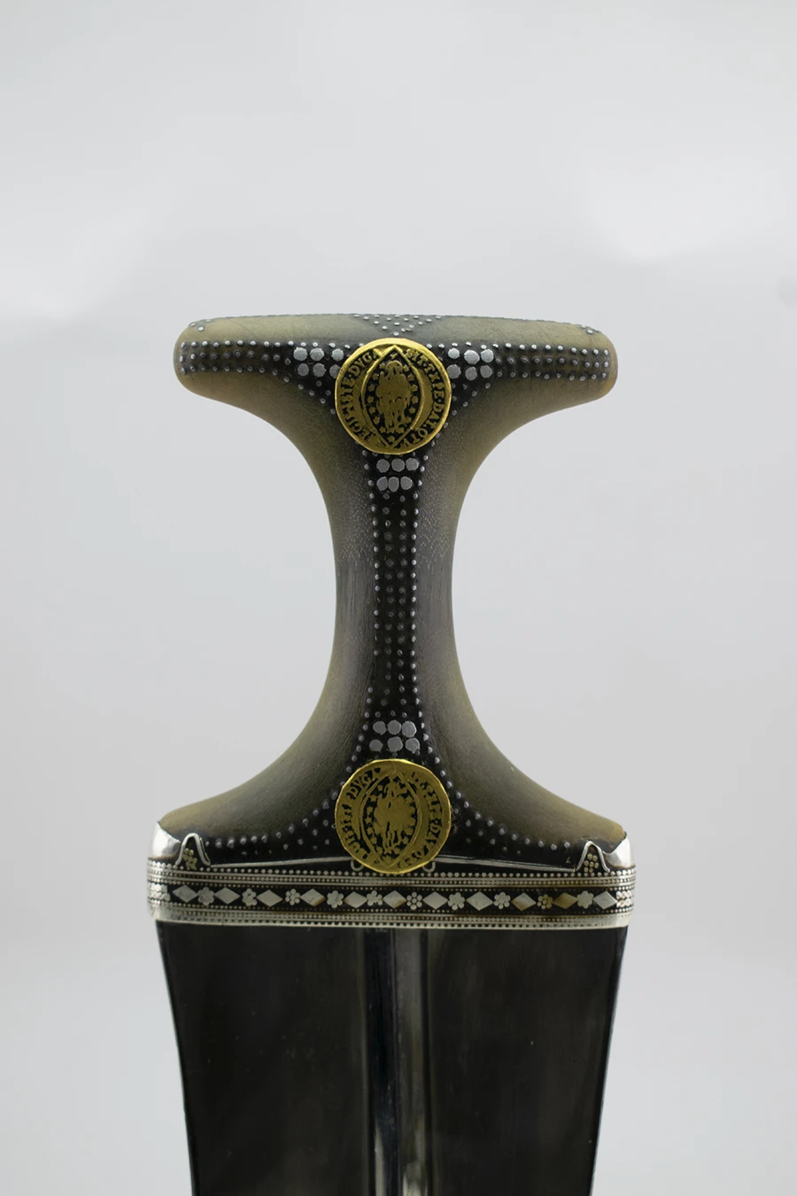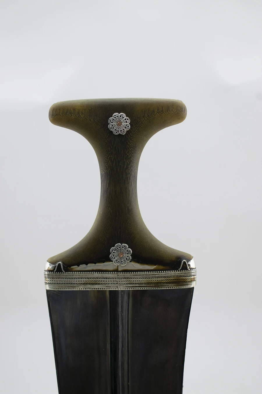 تحفة تراثية بامتياز، مصنوعة من مواد خاصة وسرية تضمن أعلى درجات الفخامة. زُيّنت بمبسم من الفضة الخالص، ونصل تعزي حاد يقاوم الزمن ويتميز بقدرته على قطع المسمار. الزخارف مزينة بزهرات طبق الأصل الذهب الحميري القديم، مما يمنحها مكانة رفيعة تليق بالنخبة وعشّاق التحف التراثية النادرة.